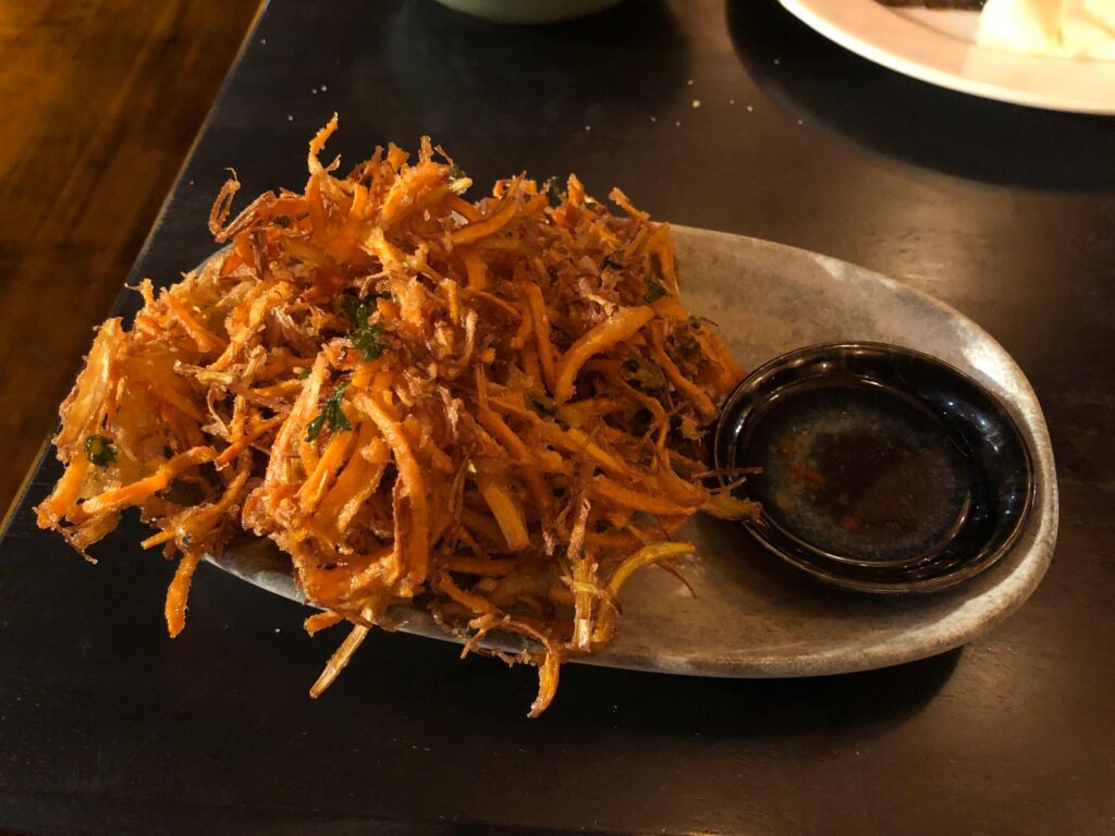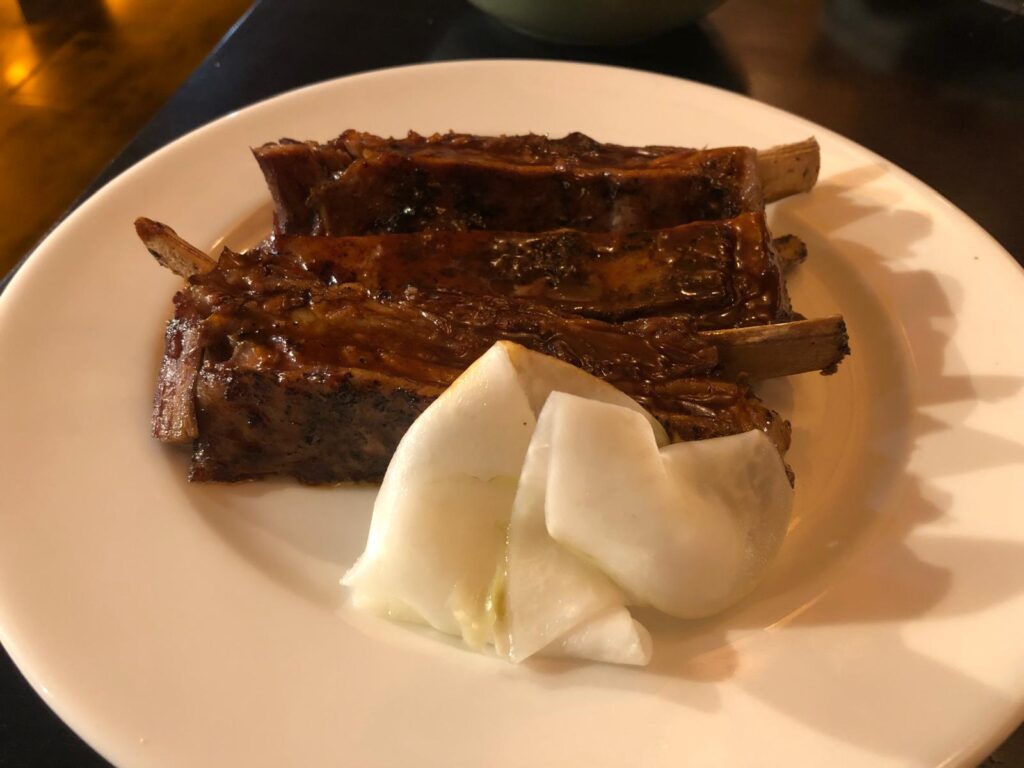 First off we had the panedesal, a soft, crusted bread roll which we used to scoop up fluffy, salty yeast butter. I could have eaten ten. We then shared the deep fried okoy – crisp baby leek fritters with spiced sugarcane vinegar, the tupa – lamb ribs, meltingly soft in a rich black bean sauce, served with crunchy kohlrabi, and what I think was my personal favourite, sinigang – tempura oyster mushrooms with a tangy tamarindy whipped tofu dip. To finish us off, we had the pyanggang, a whole chicken marinated in burnt coconut, with annato oil and atchara.